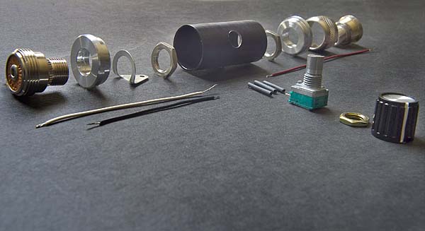 A: Yes, it can be disassembled. I would not recommend trying this without contacting me for some techniques to prevent damaging the unit. But I think once you see one, you'll rest assured that it won't fail in the first place. I truly believe it will last a lifetime without requiring any service. I use mine all the time and believe me, I don't want it to fail! I wanted to be sure it would be mechanically strong enough to endure the rather severe torque loads it might ancounter in normal use, and I sure didn't want any chance of a connector coming loose, spinning in the housing. The photograph below shows an "exploded parts diagram." The Switchcraft connectors have a knurled portion at the neck of the smaller threaded diameter. I machine the hole in the aluminum end-caps hole smaller than the diameter of this knurled portion. I then press the connectors into the end-caps with an arbor press, mechanically locking the connector to the end-cap. It can not spin! And to ensure it can't back out either, I add a nut, and a drop of Loctite® for added security. These assemblies are then press-fit into the aluminum barrels. This makes for an extremely strong joint. A drop of Loctite® is applied to these joints before fitting as well, just to be sure. |