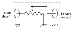 A: The control places a variable resistor, or "potentiometer", often referred to as a "pot", between the amp and microphone. The schematic diagram to the right shows how this is accomplished, and is the way both the Switchcraft control and my design work. The resistor places some load on the microphone, just as the amplifier itself does. |